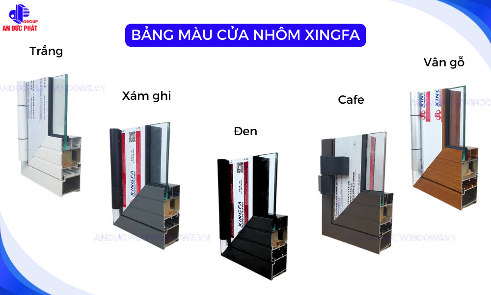 Ưu điểm này cũng tương tự đối với cửa nhôm kính Xingfa khi gia chủ có thể lựa chọn màu cửa theo sở thích. Các màu sắc phổ biến hiện nay: Trắng – Đen – Xám ghi – Cafe. Ngoài ra có màu gỗ và các màu khác theo yêu cầu (Có thể thay thế bằng màu Anode thay cho màu sơn tĩnh điện).